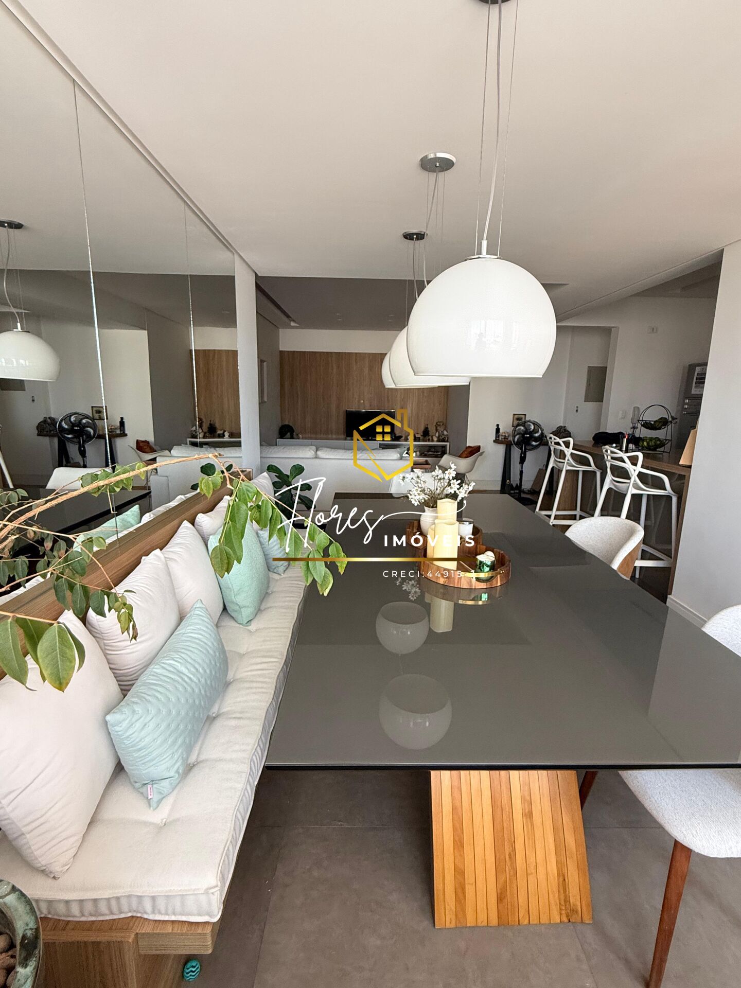 - Sala ampla em dois ambientes, totalmente envidraçada e integrada à cozinha americana.