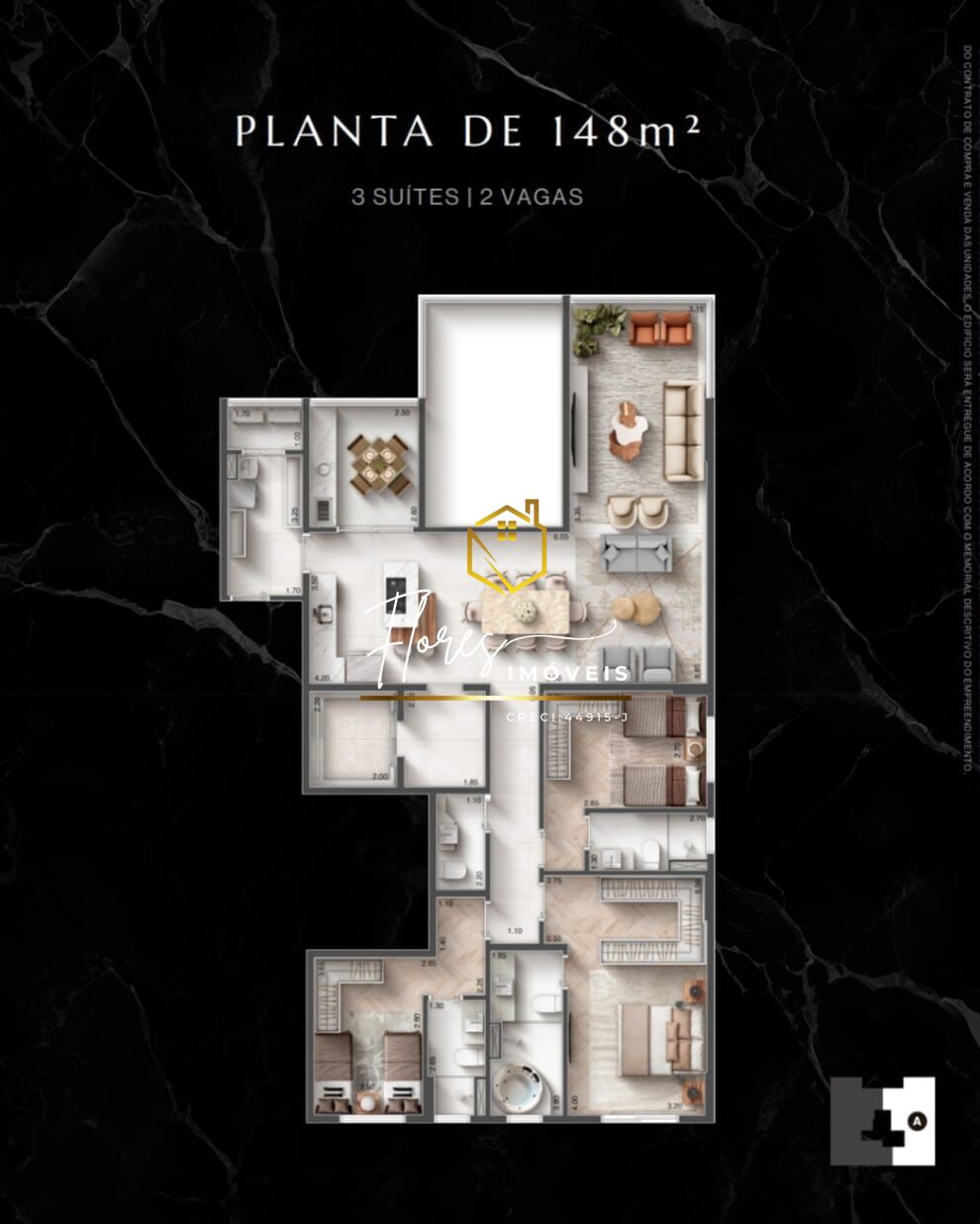 Planta com 148m², 3 suítes, 2 vagas de garagem cobertas.